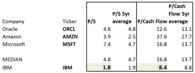 Furthermore, if we compare IBM's historic P/Sales or P/Cash Flow ratio, we can see that IBM is currently being priced very close indeed to its own historical average - there is no real bargain opportunity present.